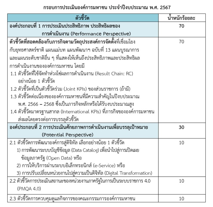 ปีงบประมาณ 2567 1. กรอบการประเมิน 1.1 องค์การมหาชนที่จัดตั้งโดยพระราชบัญญัติองค์การมหาชน